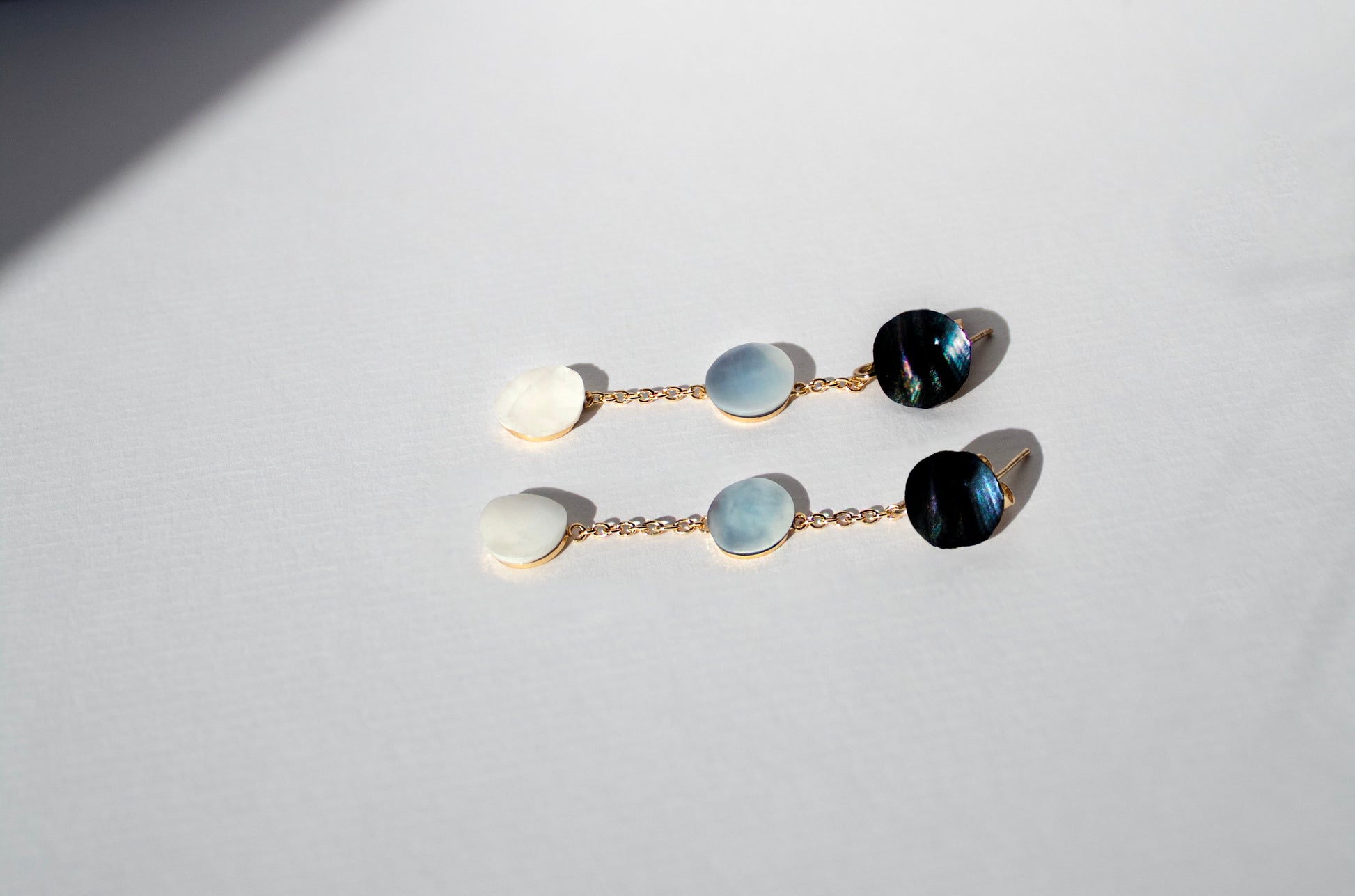 Immerse yourself in the enchanting allure of the Swedish west coast with the dazzling Symphony chain earrings. These elegant earrings features three shimmering shades of mother of pearl from the blue mussels and invasive white oyster, linked with a gold filled sterling silver chain.